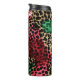 This abstract background features a playful and irregular patchwork of colorful, spotted shapes. The design includes sections in gold, red, dark red, teal, and a shimmering pink, each adorned with prominent black irregular spots, reminiscent of animal print. The shapes have slightly scalloped or textured edges, creating a unique and vibrant, mixed-media feel. This artistic pattern is ideal for fabric design, modern decor, or creative graphic projects.