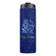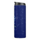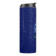 Tumbler no signo zodíaco de Sagitário em azul-prata-suave, sobreposto às estrelas da constelação, contra um fundo céu estrelado de azul-da-noite profundo