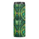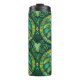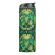 Copo alto com folhas tropicais verdes exuberantes e padrões circulares em um fundo escuro, transmitindo um tema vibrante e exótico. A vista superior mostra uma tampa preta.