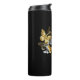 Dourada estrutura em forma de coração, decorada com ouro, joias e borboletas brancas sobre fundo preto.