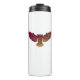 Esta design é o contorno de uma coruja com um gradiente de cor vermelho a bege e e a silhueta de um dentro de árvore.