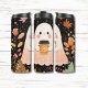 Adorable hand-drawn illustration of a sweet pastel ghost holding a pumpkin spice coffee cup, surrounded by whimsical fall foliage and a magical night sky filled with stars and autumn leaves. The warm color palette of oranges, browns, and golds brings cozy autumn vibes, perfect for Halloween lovers, coffee enthusiasts, and fans of cute seasonal art. A charming blend of spooky and sweet!