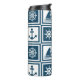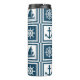 Design com temas náuticos, com roda de vela, barco à vela, bússola e decoração da âncora, em quadrados brancos e azuis com faixas