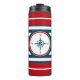 Design náutico com decoração em forma de bússola em fundo listrado vermelho, azul e branco