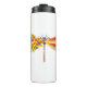 Pintura artificial, libélula floral em laranja e roxo contrastantes com papoila amarela, brilhante e florescente da Califórnia e flores silvestres azuis em fundo branco.