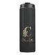 Tumbler térmico preto elegante com um monograma botânico dourado no centro.
