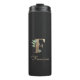 Tumbler térmico preto elegante com um monograma botânico dourado no centro.