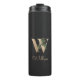 Tumbler térmico preto elegante com um monograma botânico dourado no centro.