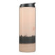 Caneca de viagem para frio ou quente com um pôr do sol sobre o lago, com um reflexo ensolarado sobre a água na paisagem de pêssego.