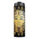 Design preto e ouro muito único com um design egípcio. Este tumbler térmico tem uma imagem impressa de uma pintura acrílica de um dos reis mais famosos do Egito.