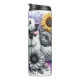 Um majestoso Excelente Pirenéus, com expressão suave e boca aberta, é enfeitado com uma terra colorida de flores pequenas, cercada por girassóis e peônias cinzentos, com borboletas fluindo nas proximidades. O trabalho de arte capta a beleza serena da raça dentro de um elegante cenário floral.