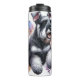 Um Schnauzer espirituoso com uma expressão feliz e aberta é capturado num salto lúdico em meio a um jardim vibrante de girassóis, peônias cor-de-rosa e margaridas roxas, com uma delicada borboleta fluindo por perto. O trabalho de arte irradia a personalidade alegre e enérgica da raça dentro de uma cena floral colorida.