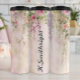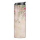 Esta bela pintura aquosa apresenta uma cascata de flores enforcadas, incluindo rosas e asterias roxos e rosa vibrantes. A luxuosa folhagem verde e as delicadas florações são feitas em estilo suave e fluido contra um fundo texturizado de tons de rosa e pêssego combinados, criando uma ilustração botânica serena e romântica.