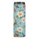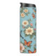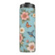 Esta é uma garrafa de água com fundo azul claro com flores, pássaros e borboletas.