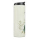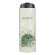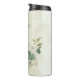 Linda caneca térmica romântica com flores verdes salvia e brancas e algumas folhas bonitas.