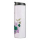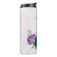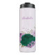 Linda tumbler térmica romântica com flores roxas e esmeralda verde e algumas folhas .