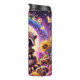 Esta é uma ilustração esbranquiçada e colorida que apresenta dois bonitos guaxinins fofos se abraçando um ao outro. Os guaxinins estão vestindo coroas florais em suas cabeças e estão sentados cercados por um campo vibrante de girassóis e outras flores. Acima deles, a palavra "FOREVER" é soletrada em uma fonte estrelada, arquitetando sobre um arco-íris brilhante. O fundo apresenta uma grande lua de cheio e estrelas cintilantes, criando uma atmosfera mágica e sonhadora.