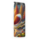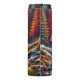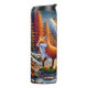 Esta ilustração pitoresca mostra uma raposa vermelha com uma cauda branca esbranquiçada cuidadosamente atravessando rochas em um rio raso. A paisagem circundante é uma vibrante floresta de outono, com árvores abrigadas em ouro, montanhas com capas de neve à distância, e folhas laranja caindo sob uma lua brilhante, cheio ou pondo sol. A cena captura a beleza serena da natureza no outono.