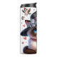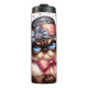 Esta ilustração caprichosa apresenta um gato rabugento com olhos azuis gritantes, vestidos com um chapéu de na moda com arco joalhado. Um grande arco de ponto-polca cor-de-rosa enfeita seu pescoço. Está rodeado de corações flutuantes, enquanto duas aves com aparência zangada sobrevoam, criando um contraste humorístico entre seu vestido elegante e sua expressão descontentada.