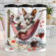 Esta imagem engraçada e sarcástica apresenta um gato esfínctico e sem pêlos relaxando em uma rede rosa. O gato está segurando uma margarida, cercado por um copo derramado de vinho, corações dispersos, e uma nota romântica. A cena contrasta espertamente os elementos românticos com a expressão rabugenta e indiferente do gato, criando uma paródia humorística de uma cena temerária.