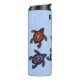 This thermal tumbler bottle to keep your drinks cold or hot has a group of turtles with brightly colored shells in orange, yellow, blue, green, and purple with abstract markings on a light blue background. Customize your name with the template.