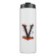 At the base of the 'V', resting on a dark, rocky surface, is a cluster of five more brightly lit jack-o'-lanterns, all carved with different, spooky faces. Several black bat silhouettes are visible, flying around the 'V' and the moon, completing the classic Halloween motif.