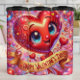 This vibrant digital illustration features a cheerful, personified red heart character with large, expressive blue eyes and a joyful smile. The central character is surrounded by a whirlwind of festive Valentine elements, including smaller floating heart balloons, shimmering stardust, and colorful ribbons. A golden banner gracefully curves across the foreground with the message "HAPPY VALENTINE'S DAY!" written in bold red lettering. This seamless-style graphic is designed as a full-wrap for insulated tumblers, providing a high-impact, 360-degree celebratory visual. The bright magenta, gold, and red color palette creates a high-energy, modern aesthetic that is perfect for holiday gifts and seasonal drinkware accessories.