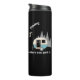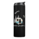 Camper themed hot or cold liquids water bottle with inspirational slogan "Home is where you park it", which can be edited to your own words. Printed with an image of a cute little teardrop style travel trailer against gray abstract mountains, moon and stars.