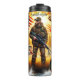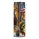 Esta ilustração vibrante mostra um caçador robusto em camuflagem, segurando uma espingarda, em pé no meio de uma grama alta em uma floresta encharcada pelo sol. Atrás dele, um veado majestoso fica orgulhoso, e uma grande bandeira americana se levanta contra um pano de fundo de luz laranja e amarela brilhantes. No primeiro plano, dois grandes peixes de caça, um baixo e outra espécie semelhante, saltam energicamente de um rio esmagador, completando essa cena abrangente de esportes e patriotismo ao ar livre norte-americano.