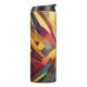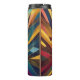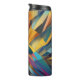 Um conjunto vibrante de formas ousadas e geométricas converge no centro, formando uma composição simétrica e colorida. A peça usa uma variedade de matizes, que vão de amarelos quentes e laranjas a legal blues e roxas.