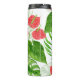 Design de padrão aquoso com flores e aves flamingos, monstera e palmeiras.