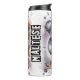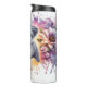 Um filhote maltês liso, com uma expressão feliz e aberta, salta dramaticamente em meio a uma variedade vibrante de girassóis, rosas cor-de-rosa e flores silvestres roxas. A composição artística captura o espírito alegre e encantador da raça num ambiente floral vivo.