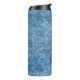 Garrafa Térmica Jeans em azul de lavagem ácida. Fundo de Denim, te