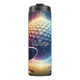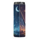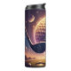 Esta ilustração fantástica representa uma bola gigante de golfe, brilhando com energia cósmica em tons de laranja e azul, posicionados sobre um campo de golfe surreal no espaço. Planetas, estrelas e uma lua crescente adornam o céu noturno, enquanto um clube de golfe está pronto para atacar, sugerindo um jogo de outro mundo.