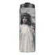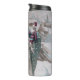 Um postal de Natal francês vintage do dominio público. Ele apresenta uma garota vestida de presentes de carregando anjo de Natal.