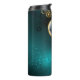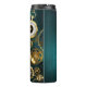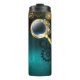 Uma lupa antiga com alça de ouro e lente convexa sobre fundo verde com engrenagens douradas e um relógio antigo. Estilo Steampunk.