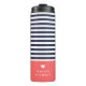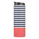 Tumbler térmico personalizado do na moda em cores coral, azul-marinho e branco. Este design apresenta um marinho clássico pré-disquete e um padrão listrado branco. Personalize-o com seu nome monograma ou outro texto personalizado com um símbolo cardíaco fofo. Use as ferramentas de design para escolher qualquer cor de fundo, editar as fontes de texto e as cores e carregar suas próprias fotos para criar uma única de uma garrafa de água com monograma.