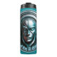 Um deslumbrante tumbler térmico de ficção científica com uma máscara de robô azul arrepiante com efeito metálico. O texto diz "Aumento do domínio do AI", mas você pode alterá-lo se quiser. É uma ponta na direção de como a inteligência artificial poderia levar a um futuro terrível onde as máquinas têm domínio sobre os humanos.