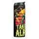 Uma ilustração dinâmica e vibrante apresenta dois aliens de pele verde, um grande e um pequeno, posicionados contra um pôr do sol laranja e listrado amarelo. Vários discos voadores com feixes brilhantes descem de cima. O texto proeminente "LEVE-ME JÁ!" acrescenta um apelo humorístico e extraterrestre.