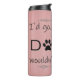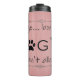 O perfeito batedor para quem prefere ficar em casa com o cachorro em vez de sair. O design de tumbler térmico mostra texto que diz "Eu ia...mas o meu cão não o permitiria." com uma pata impressa e uma silhueta de cão embelezada contra um fundo de madeira rosa. Itens de presentes adicionais disponíveis com este design também.