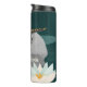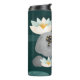 A detailed and naturalistic flat-style illustration of a fire salamander — rendered in dramatic black with vivid yellow spots — crawling across smooth grey rocks, surrounded by elegant white water lilies in a deep teal pond. The high contrast between the salamander's markings and the soft background creates a striking visual. This art piece appeals to nature enthusiasts and collectors of unique botanical and wildlife art.