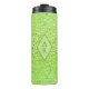 O padrão nesse tumbler térmico único se assemelha a pequenos segmentos de vidro reunidos em estilo mosaico. Em tons de verde limão brilhante, quase parece brilhar. Na frente central está uma faixa de lado quádrupla em verde pálido que segura seu monograma de duas letras.