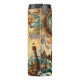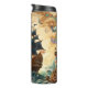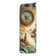 Esta ilustração fantástica e vibrante apresenta um grande navio pirata majestoso com velas azuis escuras navegando num mar ondulado e giro. O fundo é um mapa do tesouro vintage com um rosa de bússola proeminente. A cena é enquadrada por litorais rochosos com faróis e navios menores, todos em um estilo estilizado, como um sonho de arte.