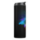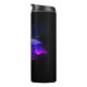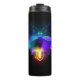 Voz mecânica, antiga, com lâmpada e asas finas brilha cor de laranja, roxo, turquesa sobre fundo preto. Estilo Steampunk.
