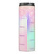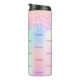 Um unicórnio arco-íris tenso, colorido, holográfico, cor de fundo rosa, roxo, verde-menta. Decorado com gotas de brilho sujo em rosa e roxo. Personalize e adicione um nome, letras cor roxa. O nome como um padrão de fundo.