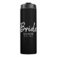 Mantenha-se hidratado no estilo com este Tumbler Térmico de Nome Personalizado de Script Branco Preto Moderno. Ele foi projetado com "noiva" em letras brancas modernas e brutas. Personalizado com o nome da noiva e ano de casamento. Plano de fundo preto personalizável. Ideia de presente de excelente para chá de panela, festa de solteira ou lua de mel.