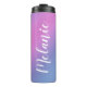 Tumbler de café térmico gradiente colorido com tipografia de nome - gráfico de metal com Na moda escovado com cores cor rosa e roxa de gradiente ombre. Personalize o modelo de nome do script de caligrafia personalizado com seu nome próprio. Um presente de na moda para o seu aniversário, caixa de sugestões de damas de honra, dia de as mães, festa de solteira, etc.