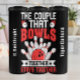 Esse gráfico apresenta uma bola de boliche vermelha e cinco pinos, com textura angustiada e granulada. A design inclui o texto espirituoso 'O CASAL QUE BOWLS JUNTOS SE MANTÉM,' criando um gráfico simples e divertido para um perfeito casal que adora jogar boliche juntos.