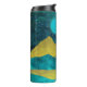 design de paisagem da montanha abstrato em tons de ouro, ciano e azul em tons negros, com um nascer, estrelas e pássaros.