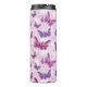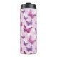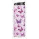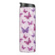 Um padrão perfeito de borboletas voadoras em tons de pinks e roxos com flores brancas sobre fundo rosa claro. © e ® Bigstock® - Todos os direitos reservados.